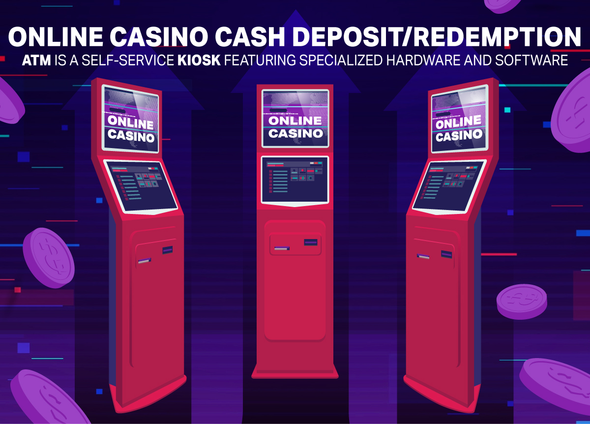 An interactive online social casino cash deposit/redemption ATM is a self-service kiosk featuring specialized hardware and software that provides access to online casino applications for setting up a player account and redeeming gaming cash payouts/prizes. Online casino player deposit/redemption kiosks are becoming a great asset for participating establishments like restaurants, bars, convent stores, game rooms and typically placed in high foot traffic areas throughout the property.